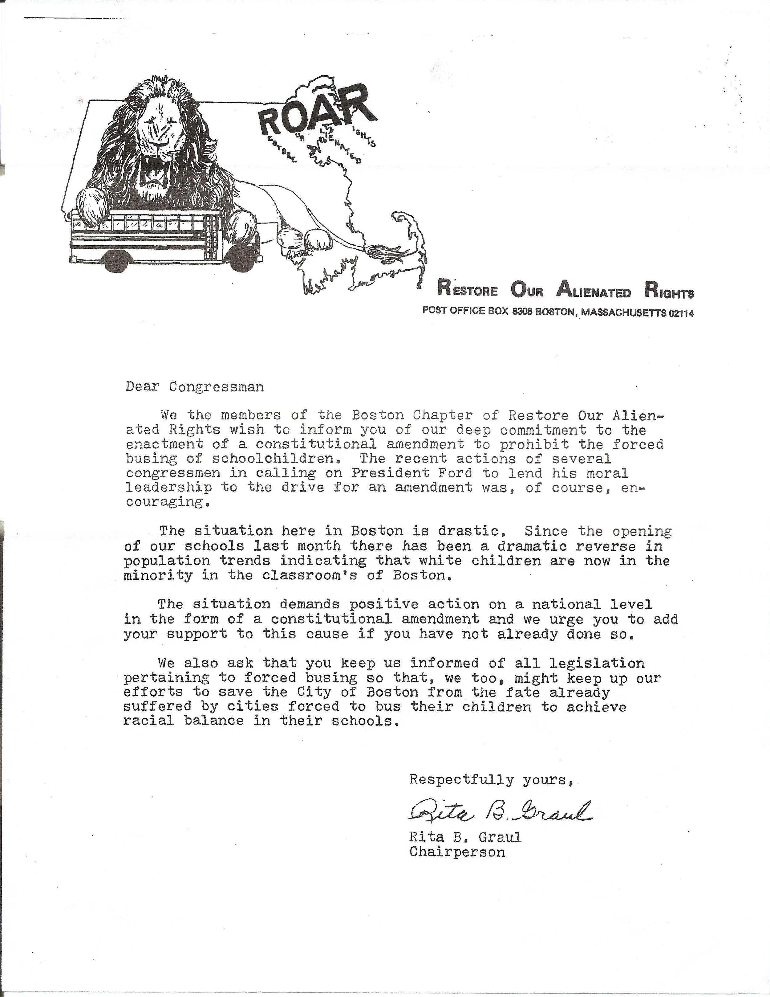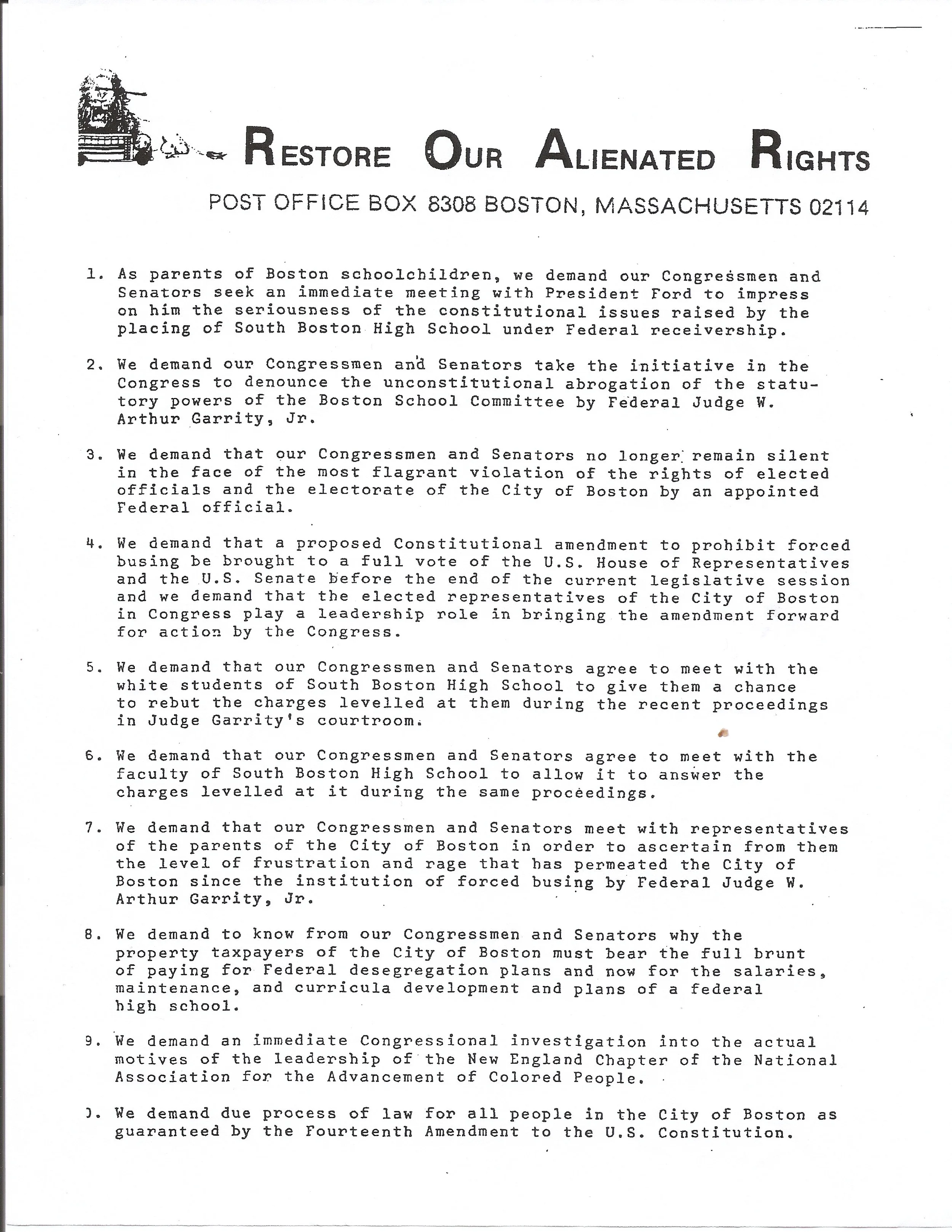 Chantal: This document in my opinion is really important because it shows an organization that was actually against bussing. Also it shows how the people intending to act violently decided to send a letter to try to change the situation. This also shows how people felt about the situation and wanted a change.