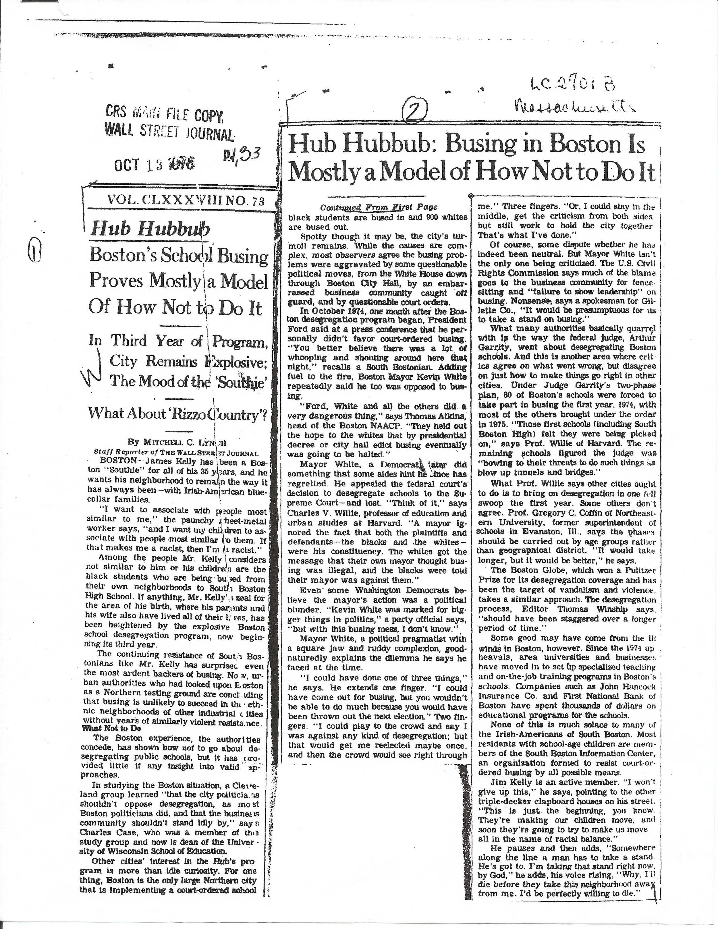This newspaper article answers one of our main questions, "How did busing affect Boston?" This article shows how students were fleeing schools and families were not cooperating with black students coming into the schools. It shows chaos within Boston Public Schools because of the racial tension around busing.